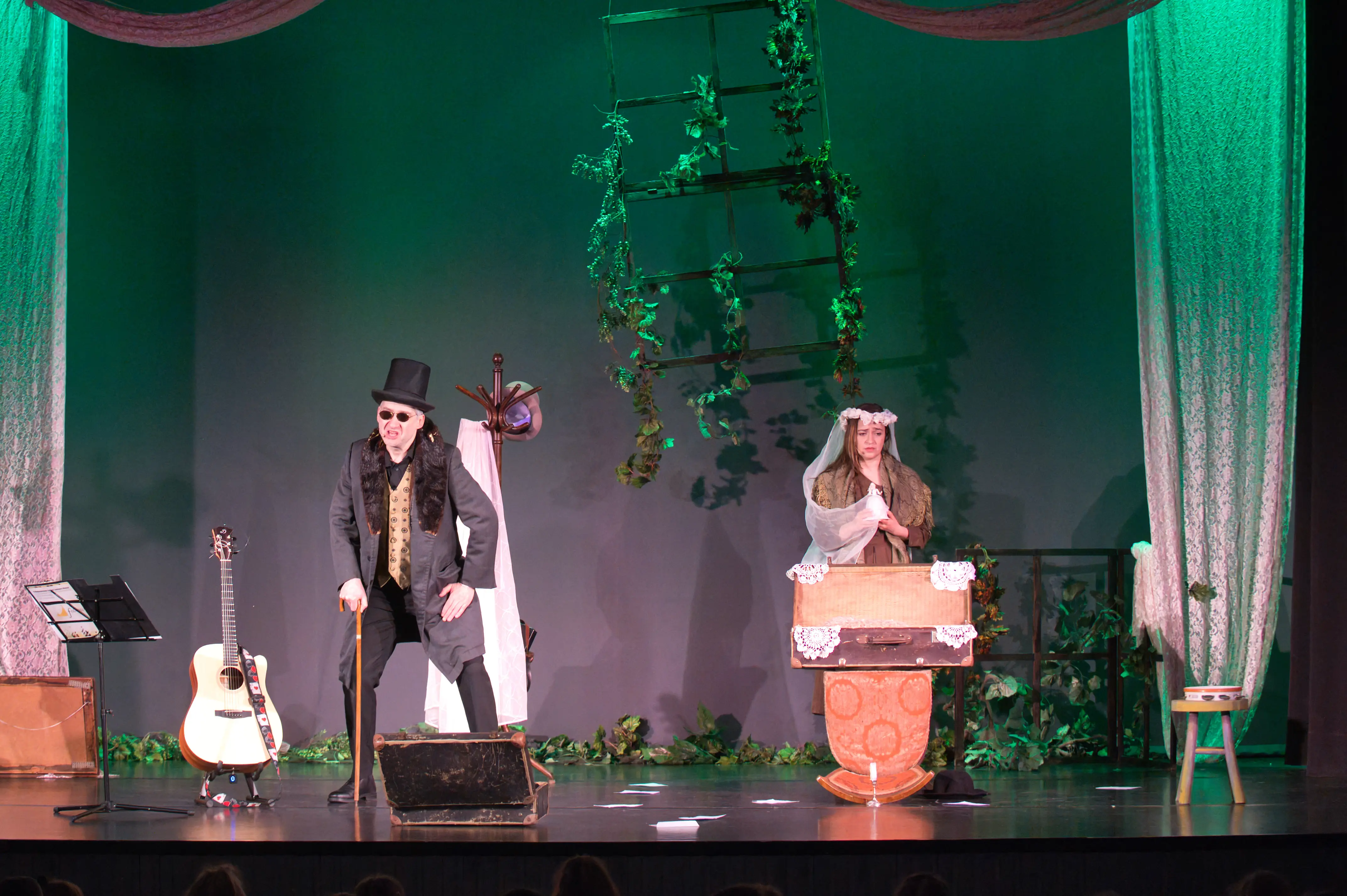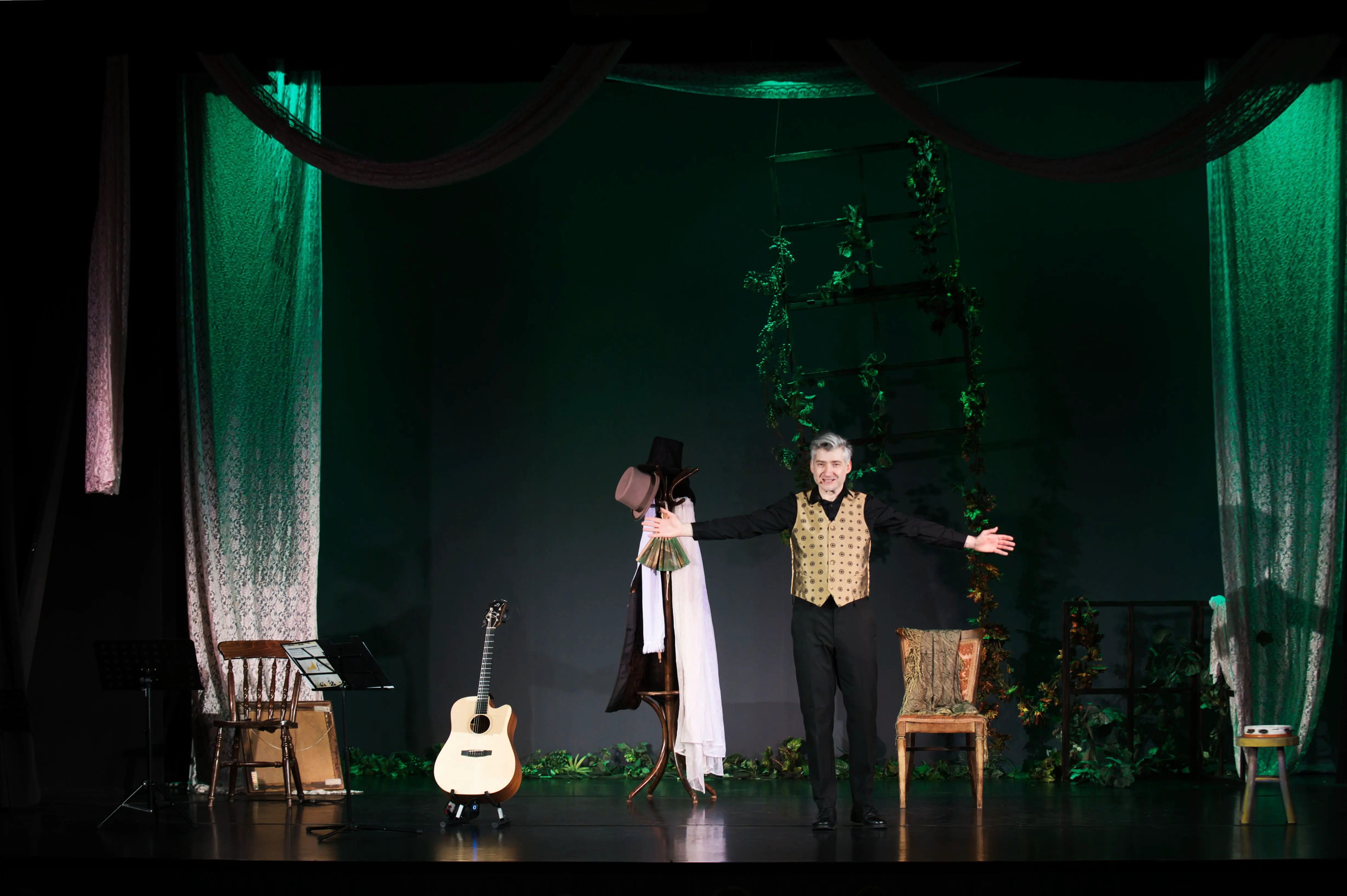 Konwencja spektaklu zobowiązuje aktorów do ogromnej ekspresji, wyrazistości użytych środków artystycznych oraz umiejętności gry na instrumentach muzycznych.